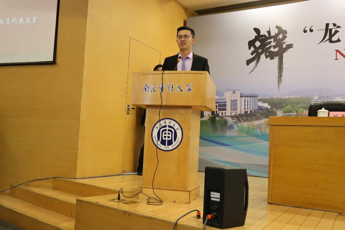 接下来来自南京大学的学生作为参赛队员代表发言,他感谢南审精心组织这样高规格的赛事,为大家提供了思想交流、碰撞的平台。作为同城高校,他也邀请了各参赛队伍前往南京大学交流。
