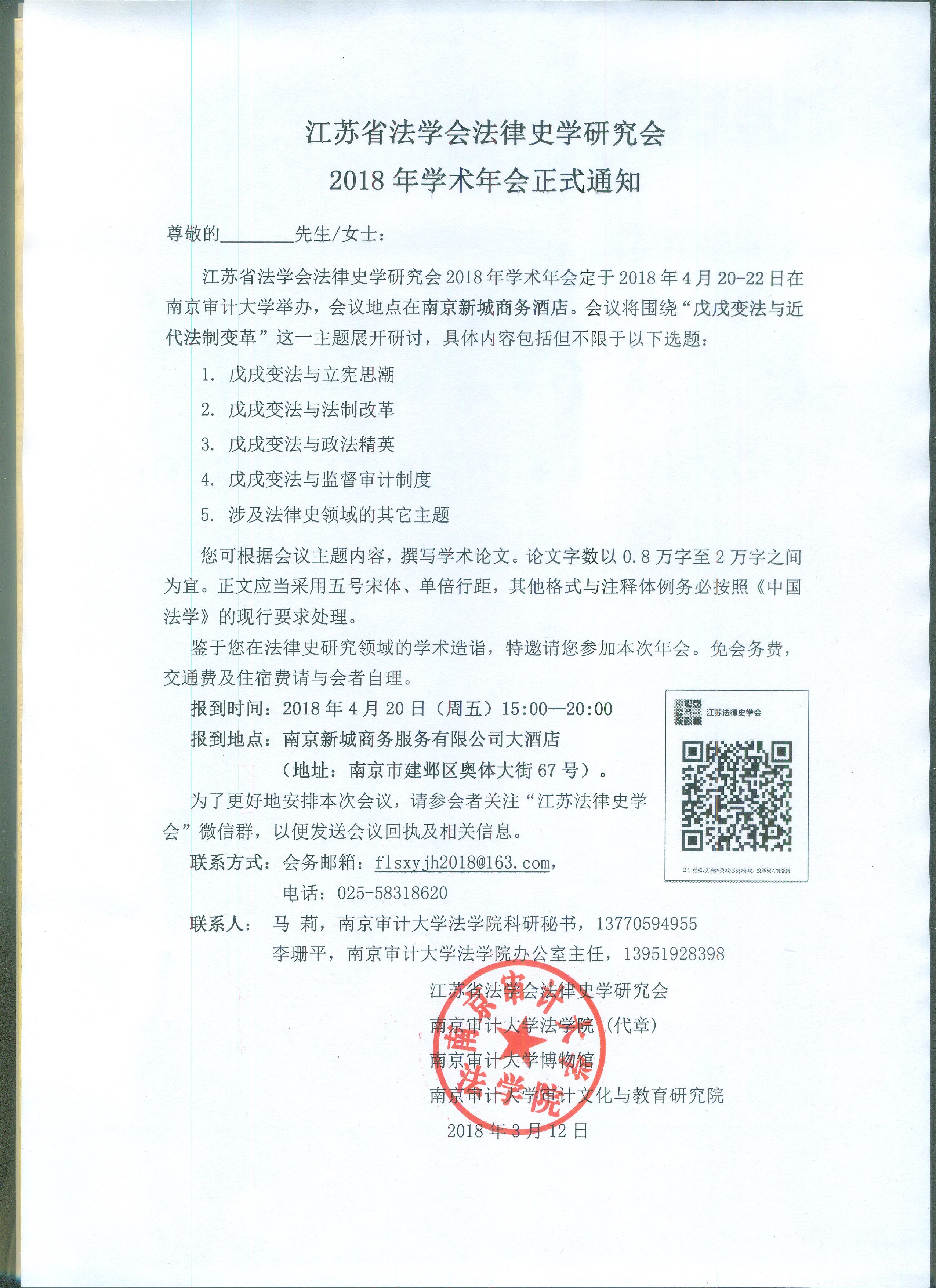 为了更好地安排本次会议,请参会者关注“江苏法律史学会”微信群,以便发送会议回执及相关信息。(微信群二维码详见附件)