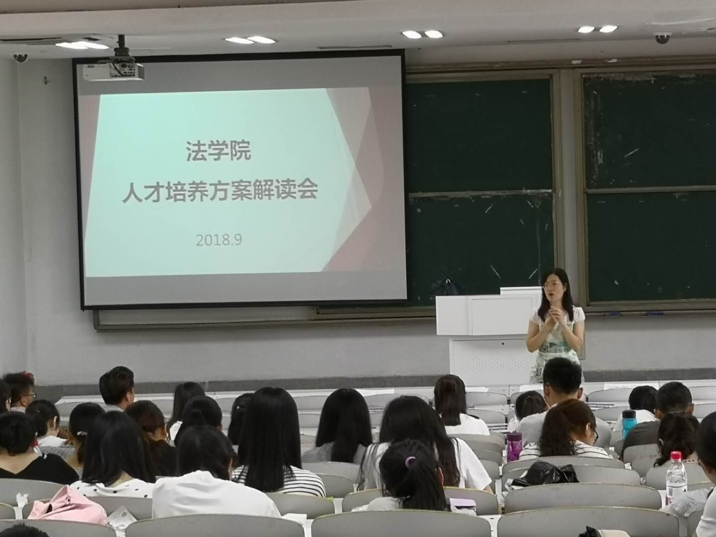 法学系主任孙展望老师在竞北104教室,为法学专业学生详尽地解读了人才培养方案设计的缘由及目标。他认为,人才培养方案犹如专业教育之灵魂,随着新时代对法律人才需求的提高,人才培养方案也必须适应时代发展要求。培养基础知识扎实的应用型法律人才,是我校法律人才培养最终目标。因此,法学专业教学计划分三个方面:通识教育、专业教育、实践教育。首先,他强调了通识教育的重要性和必要性,认为通识教育可以使同学们开阔视野,提高思考效率,特别是辩论赛,可以训练思维能力和语言表达能力,对法学专业技能提高大有裨益。其次,在专业学习方面,法律职业资格考试是评判大学四年专业学习的最好的手段,他建议同学们对专业基础课、学科基础课和专业主干课一定要掌握扎实,而不仅仅满足于及格,同时结合自己的兴趣选修专业课,这样才能面对各种考试游刃有余,才能成长一名合格的法律人;接着,孙老师强调,专业知识最终都要转换成自己的动手能力,实习实践是最有效的方式,他建议同学们尽可能要到公检法机关和律师事务所等单位实习,只有这样,才能将通识教育和专业教育所学知识融合起来,变成实际操作能力;最后,孙老师详细讲解了每一类、每一门课程的设置目的与意义。孙老师还建议同学们要合理安排时间,尽早完成选修课的学习,对毕业论文、大创、实习尽早着手准备,对自己的学习安排要未雨绸缪。另外,孙老师还强调了考研对于未来工作的重要性,为同学们提供了中肯的学习建议。