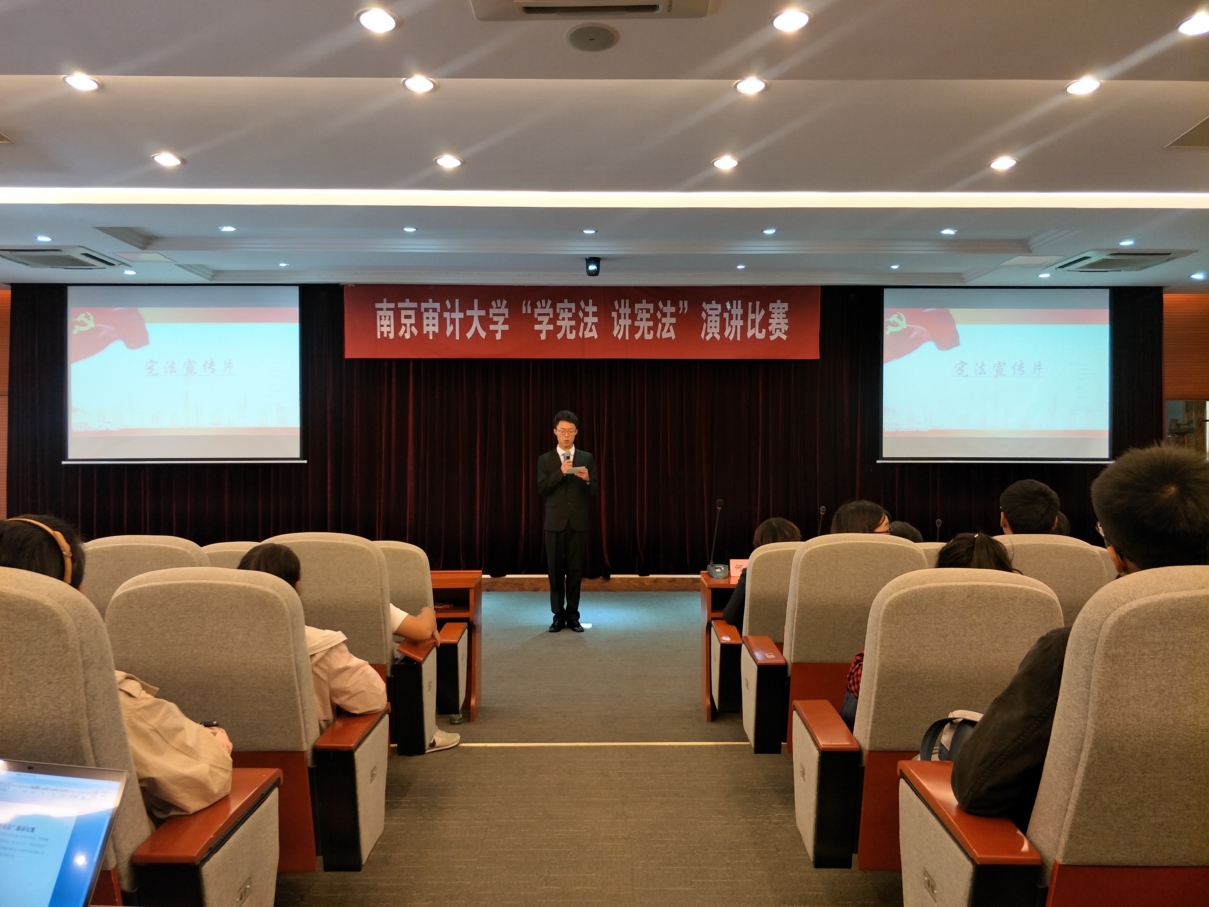比赛伊始,全体在场人员共同观看了宪法宣传片,并进行了宣誓。接着,演讲比赛正式开始,七名入选选手从不同角度表述了自己对宪法的理解。大家结合具体法条,说明相关案例,从身边的事件说明宪法的重要性。此外,参赛选手们一致认为宪法是我国根本大法,需要每一个人去弘扬和遵守。随后,在命题演讲环节,七位选手围绕“为什么说我国是人民共和国”,“国务院总理的权力大吗”,“监察委员会与同级人大常委会的关系”,“如何理解宪法规定的‘法律面前人人平等’”做出了即兴演讲。