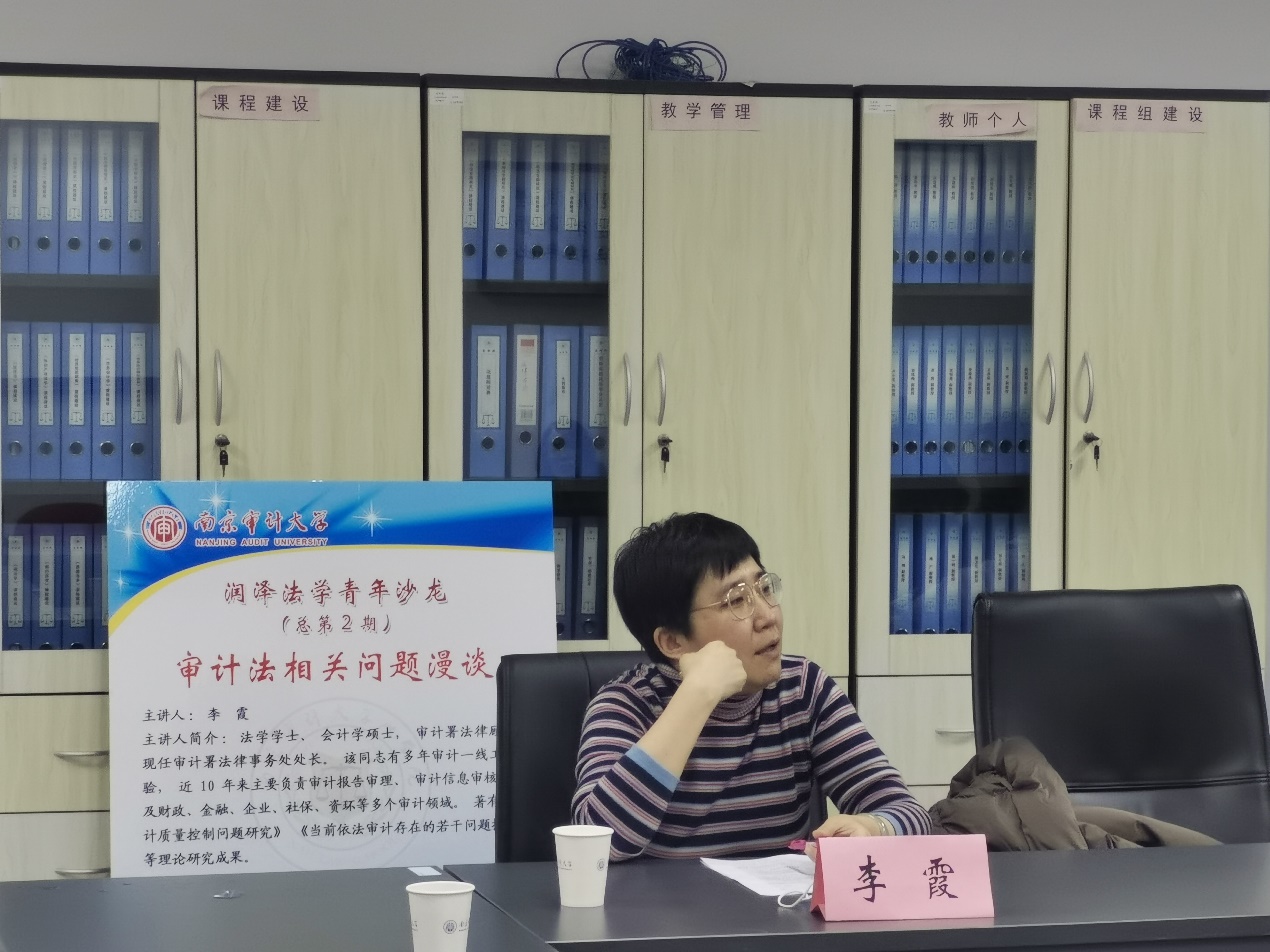 2020年12月28日晚,色情卡通 “润泽法学青年沙龙”第2期有幸邀请到审计署法规司法律事务处处长李霞与大家探讨审计法相关问题。沙龙在文济307举办,由色情卡通 副院长徐彰主持,政府审计学院杨柔坚老师,色情卡通 苏欣、沈玲、鲍红香、郑祺、陈苏豪老师,色情卡通 审计法学方向和宪法学与行政法学方向硕士研究生参加了本次沙龙。