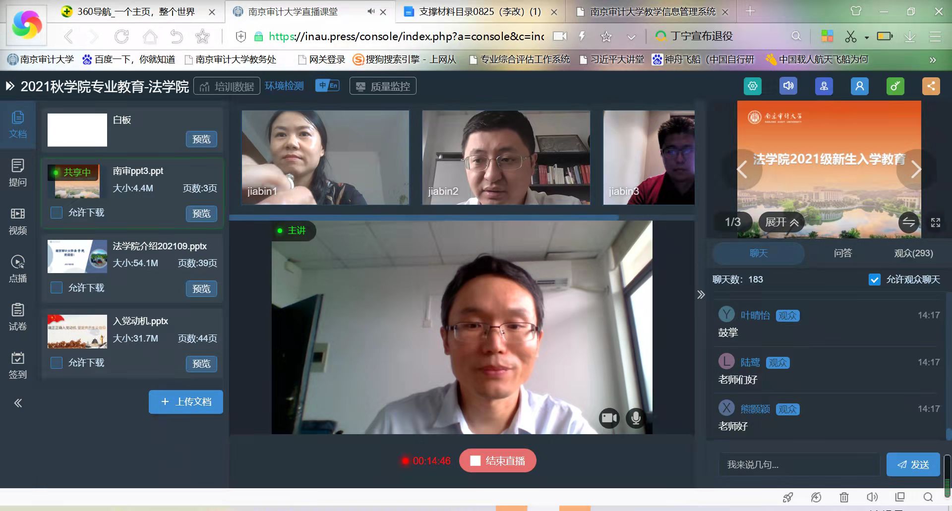 徐彰副院长介绍了学院的研究生培养情况,南审法学研究生教育虽然历史短,但在全体师生的努力下取得了一系列成绩。他提醒同学们在本科阶段要有目标、有规划地学习,打好专业基础,培养思辨能力,争取在四年之后,能够选择自己感兴趣的专业方向继续深入学习,进一步提升自己的法律理论素养,增强解决实际法律问题的能力。