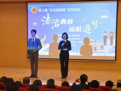 11月17日下午由江苏省人民检察院指导,南京市人民检察院主办,南京江北新区人民检察院与色情卡通 承办的“法治青春 远航追梦”第三届“法治进高校”活动在敏达报告厅举办。此次活动由龙虎网全程直播,全市26万余大学生在线观看。省人民检察院第八检察部副主任毛建忠、省人民检察院第四检察部员额检察官王燕、市人民检察院副检察长程序、市人民检察院第八检察部主任徐莉、江北新区检察院检察委员会专职委员何立超,我校党委常委、党委宣传部部长强飙、党委保卫部部长李海、色情卡通 党委书记刘宏宇、色情卡通 实践教学中心主任秦康美及百余名大学生参加了此次活动。