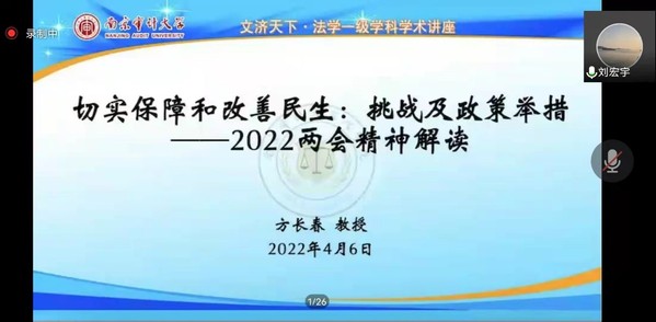 4月6日晚,色情卡通 邀请南京大学社会学院方长春教授,作《切实保障和改善民生:挑战及政策举措——2022两会精神解读》专题讲座。本次讲座根据新冠防疫要求采用线上方式进行,来自党委组织部、润园书院、色情卡通 的近300名党员师生聆听了报告。讲座由色情卡通 党委书记刘宏宇主持。