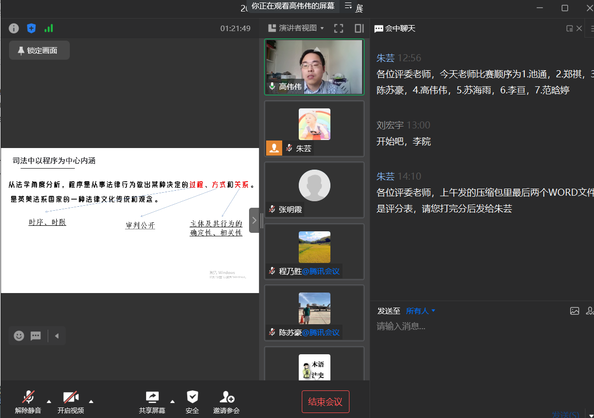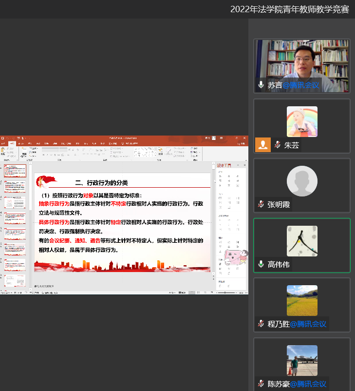 为全面考察教师的教学能力,本次比赛由课堂教学展示和教学设计评比两部分构成。参赛老师前期分别就所授课程准备五个教学节段,并提供相关教学设计材料;比赛时随机抽取任意一个教学节段进行15分钟的课堂教学展示。在比赛过程中,各位参赛老师表达流畅,教学思路清晰,方法手段先进,展示了扎实的法学理论功底和良好的教学素养。