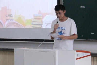 在校生代表2021级法会3班马平阳向新生同学们分享自己学习生活的经验。他告诫同学们要早做规划、提前准备。同时,他提醒同学们一定要注意劳逸结合,学业繁重也不能累坏身体,要循序渐进,一步一个脚印。