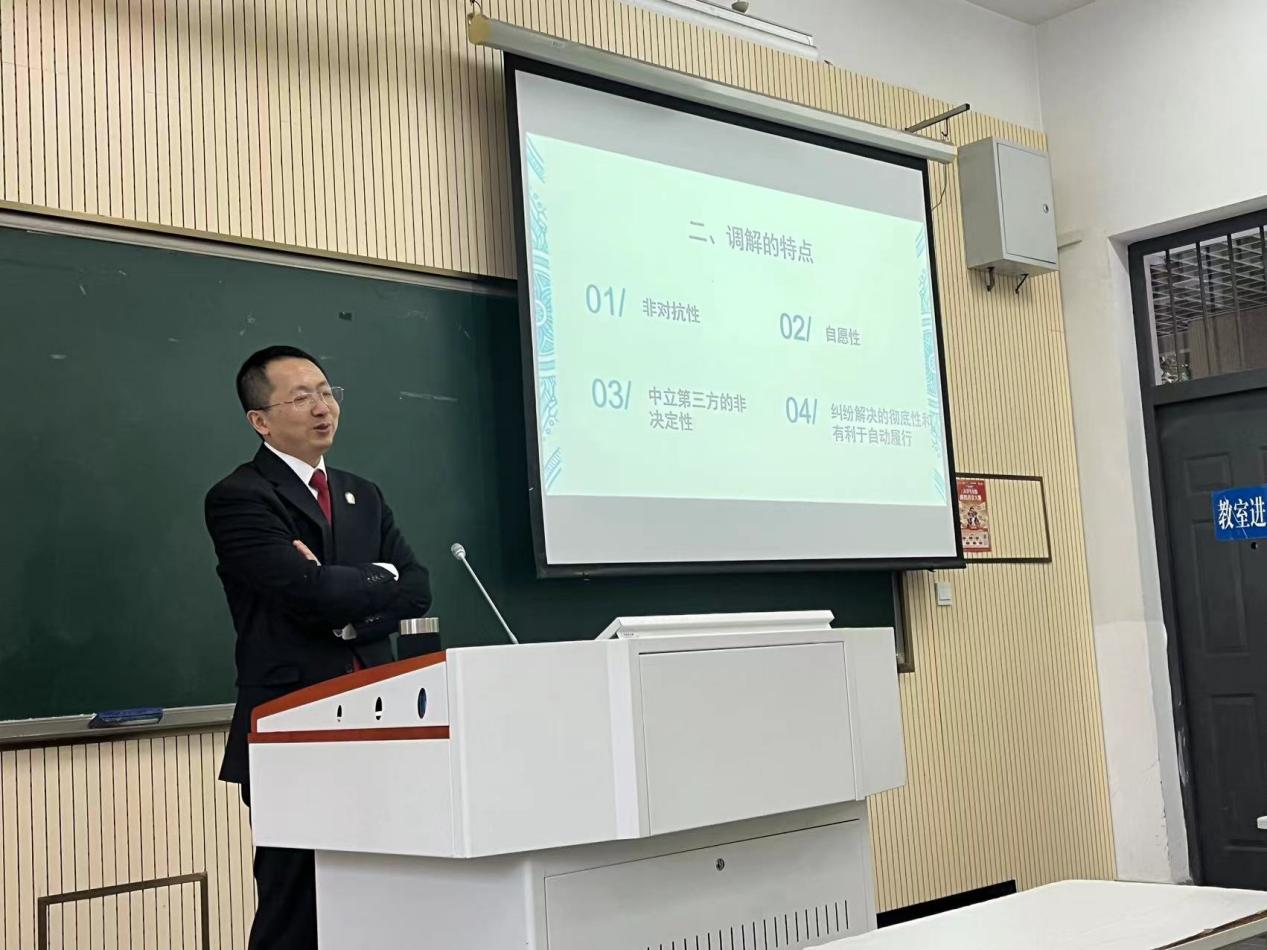 汪法官的课堂分两个阶段,一是讲授阶段,二是指导阶段。在讲授阶段,汪法官首先以调解的基本概念为起点,讲解了民事、行政、刑事调解的基本概念,给同学们初步构建了法律调解的体系。其次,汪法官详细地向同学们介绍了调解的原则,即自愿原则、合法原则、尊重民俗原则、查明事实、分清是非原则。最后,汪法官结合自己多年办案经验,重点向同学们讲授了调解技能,他强调调解要从人性与和谐的角度入手,要分析当事人纠纷的原因,调解效果要从解决纠纷的成本上的考虑、情感上的满足、最终处理结果的可控性、社会和谐度和幸福指数等多因素进行衡量;在讲授阶段结束后,汪法官让同学们进行课堂模拟调解,同学们分小组进行模拟,汪法官对同学们的模拟进行详细指导与初步总结,然后让同学们再模拟,最后汪法官对同学们的模拟进行最终总结。