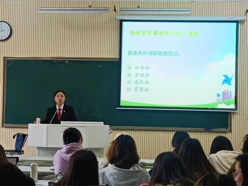 最后,鄢法官还给同学们播放了由浦口区人民法院拍摄的以调解为主题的微电影《林里》,向同学们讲解了法官们如何对于农村承包地苗木归属问题引起的财产损害赔偿纠纷案件进行的调解,向同学们概述到调解化解邻里间怨气和心结的重要性,以及向同学们强调调解需要法律工作者们的共同努力才能打造出和谐社会。