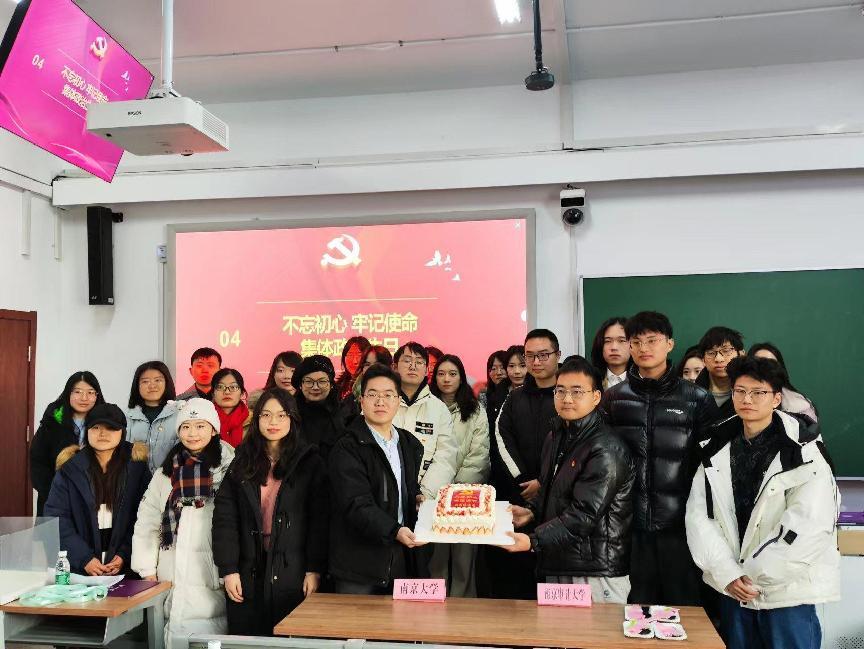 随后,两校进行党支部共建学习交流分享。首先由南京大学色情卡通 发言分享,陈一铭同志对习近平总书记于南京大学建校120周年之际给南大留学归国青年学者的回信精神进行领学,并介绍支部的特色党建活动;副书记彭睿智负责介绍南京大学浦口校区情况;色情卡通 研究生第一党支部书记魏龙凡同志,传达习近平总书记给色情卡通 的回信精神和介绍支部特色活动;第二党支部宣传委员许诺同志传达了中共中央政治局就涉外法制展开的学习精神;卢春雪同志、姜方申同志围绕总书记给色情卡通 的回信精神以及学习科研方面分享心得体会。
